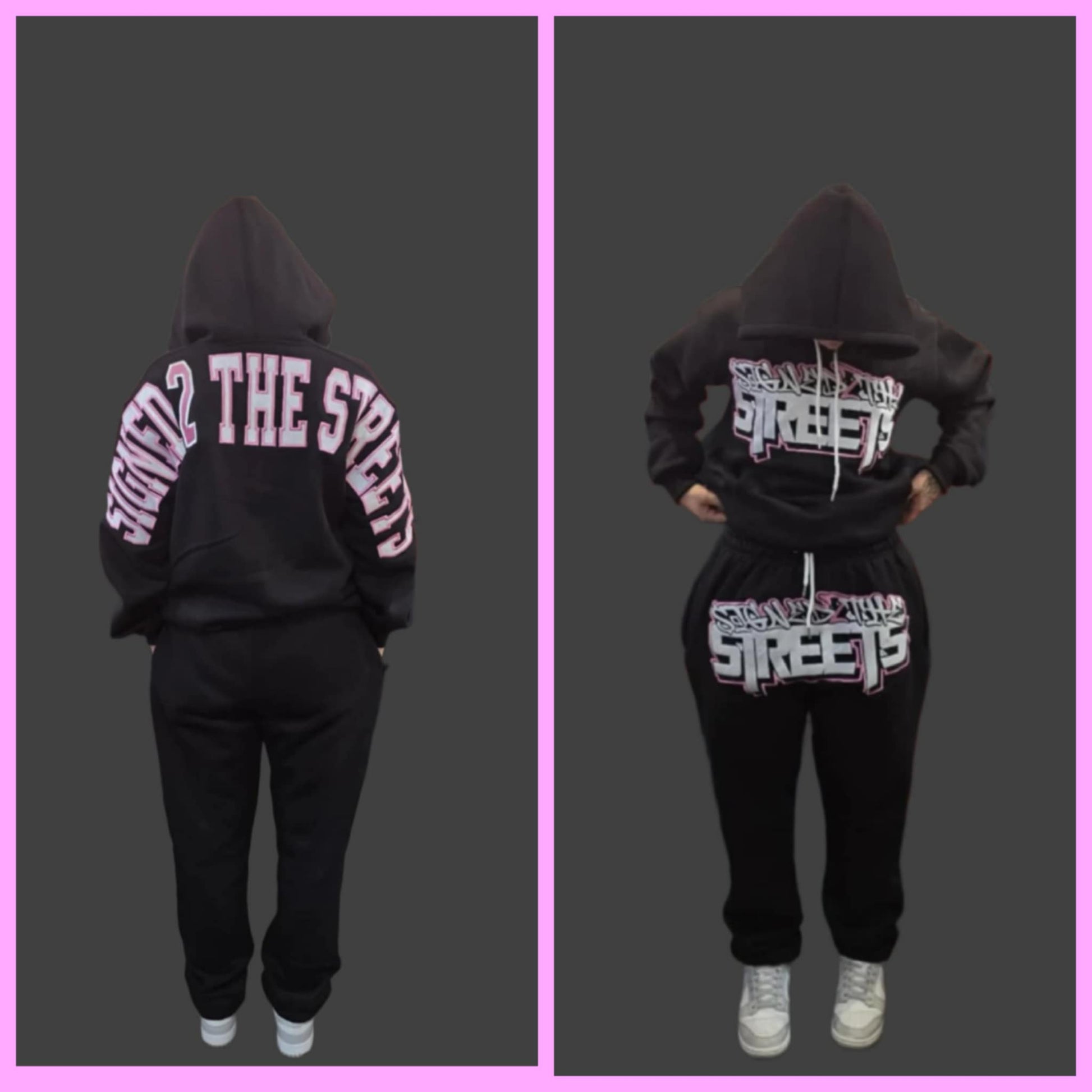 This product features premium material with meticulously crafted embroidered designs. The 450GSM heavy material boasts double stitching on the cuffs and bottoms for added durability. The pants also include convenient zipper pockets, while both the hoodie and pants have draw strings for adjustable fit.